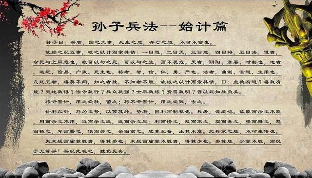 故经之以五事,较之以计而索其情:一曰道,二曰天,三曰地,四曰将,五曰法。道者,令民与上同意也,故可以与之死,可以与之生,而不畏危;天者,阴阳、寒暑、时制也;地者,远近、险易、广狭、死生也;将者,智、信、仁、勇、严也;法者,曲制、官道、主用也。凡此五者,将莫不闻,知之者胜,不知者不胜,故较之以计而索其情;曰主孰有道?将孰有能?天地孰得?法令孰行?兵众孰强?士卒孰练?赏罚孰明?吾以此知胜负矣。